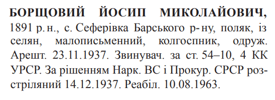 Соціальне походження: із селянОсвіта: малописьменнийПрофесія (місце роботи): колгоспникСімейний стан: одружений, 1 дитинаЗаарештований: 23.11.1937Звинувачення: ст. 54-4, 54-10 КК УССРНаркомом ВС і Прокурором СССР засуджений до розстрілуДата вироку: 09.12.1937Йосип Борщовий розстріляний 15.12.1937 р. в м. ВінницяРеабілітований: Верховним судом УССР 10.08.1963 р.