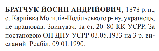 20-80 КК УССР. ОН ГПУ УССР засуджений до 3 років заслання