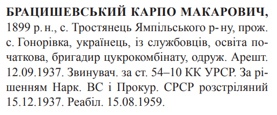 Карпо Брацишевський розстріляний 15.12.1937 р. в м. Могилів-Подільський.