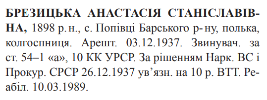 Реабілітована: Вінницькою облпрокуратурою 10.03.1989 Реабілітовані історією