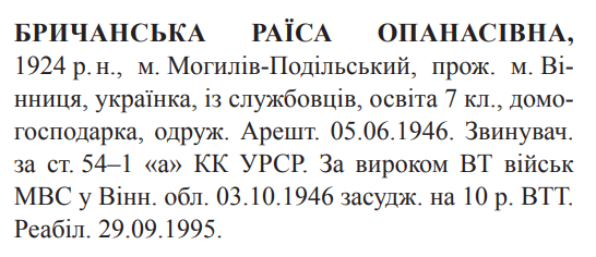 54-1 "а" КК УССР. Трибуналом військ МВС Вінницької обл. засуджена до 10 років ВТТ