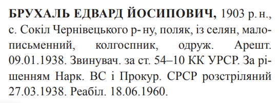 Соціальне походження: із селянОсвіта: малописьменнийПрофесія (місце роботи): колгоспникСімейний стан: одружений, 1 дитинаЗаарештований: 09.01.1938Звинувачення: ст. 54-10 КК УССРНаркомом ВС і Прокурором СССР засуджений до розстрілуДата вироку: 09.02.1938Адверт Брухаль розстріляний 28.03.1938 р. в м. ВінницяРеабілітований: Верховним судом УССР 18.06.1960