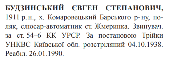 Євген Будзинський розстріляний 04.10.1938 р. у Києві.