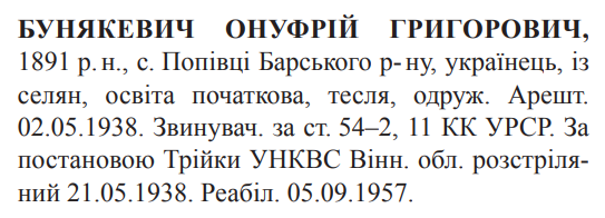 Онуфрій Бунякевич розстріляний 21.05.1938