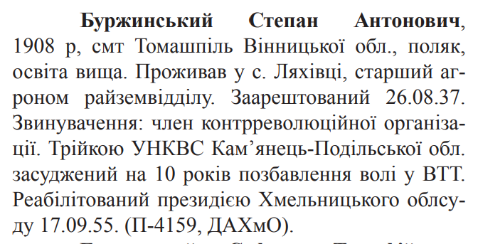 Соціальне походження: н/дОсвіта: вищаПартійність: н/дПрофесія (місце роботи): старший агроном райземвідділуСімейний стан: н/дЗаарештований: 26.08.1937Звинувачення: "член контрреволюційної організації"Трійкою УНКВД по Кам'янець-Подільській обл. засуджений до 10 років ВТТДата вироку: н/дРеабілітований: Президією Хмельницького облсуду 17.09.1955 р.