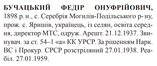 Федір Бучацький розстріляний в м. Могилів-Подільський 27.01.1938