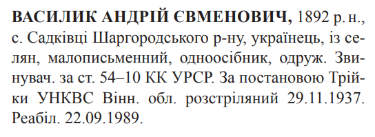 Реабілітований: Вінницьким облпрокурором 22.09.1989