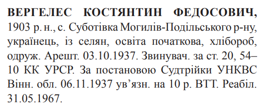 20-54-10 КК УССР. Трійкою УНКВС Вінницької обл. засуджений до 10 років ВТТ