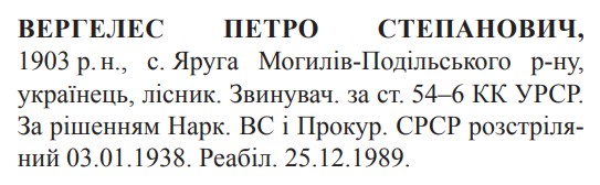 Петро Вергелес розстріляний 03.01.1938
