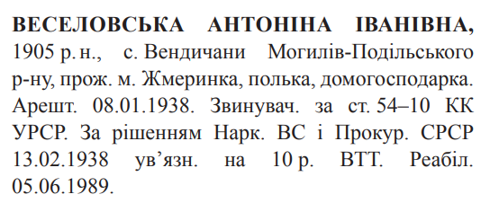 Реабілітована: Вінницькою облпрокуратурою 05.06.1989 Реабілітовані історією