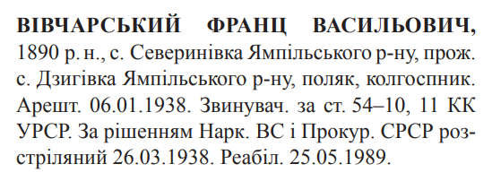 Франц Вівчарський розстріляний в м. Вінниця 27.03.1938