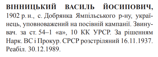 Василь Вінницький розстріляний 16.11.1937