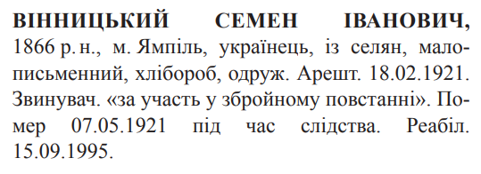 Семен Вінницький помер під час слідства 07.05.1921 р.