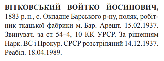 Соціальне походження: н/дОсвіта: н/дПрофесія (місце роботи): робітник ткацької фабрикиЗаарештований: 15.02.1937Звинувачення: ст. 54-4, 54-10 КК УССРНаркомом ВС і Прокурором СССР засуджений до розстрілуДата вироку: 09.12.1937Войтко Вітковський розстріляний 15.12.1937 р. в м. ВінницяРеабілітований: Вінницькою облпрокуратурою 18.04.1989