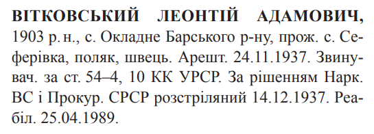 Соціальне походження: н/дОсвіта: н/дПрофесія (місце роботи): швець колгоспуЗаарештований: н/дЗвинувачення: ст. 54-4, 54-10 КК УССРНаркомом ВС і Прокурором СССР засуджений до розстрілуДата вироку: 09.12.1937Леонтій Вітковський розстріляний 15.12.1937 р. в м. ВінницяРеабілітований: Вінницьким облпрокурором 25.04.1989