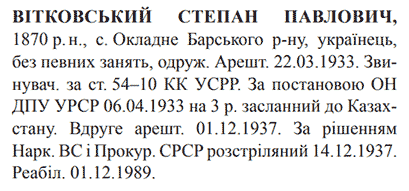 Соціальне походження: н/дОсвіта: н/дПрофесія (місце роботи): без певних занятьЗаарештований: 22.11.1937Звинувачення: ст. 54-10 КК УССРНаркомом ВС і Прокурором СССР засуджений до розстрілуДата вироку: 09.12.1937Степан Вітковський розстріляний 15.12.1937 р. в м. ВінницяРеабілітований: Вінницькою облпрокуратурою 13.04.1989