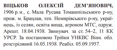 Олексій Віцьков розстріляний 16.05.1938 р.