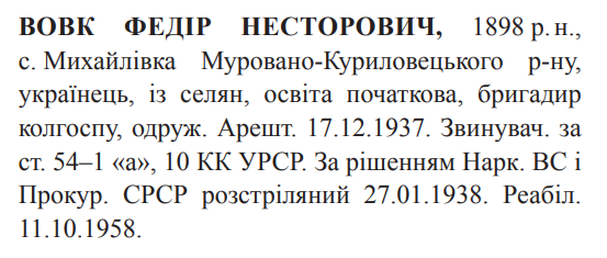Федір Вовк розстріляний 27.01.1938