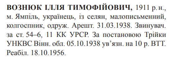 54-6, 54-11 КК УССР. Трійкою УНКВС Вінницької обл. засуджений до 10 років ВТТ