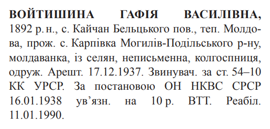 Реабілітована: Вінницькою облпрокуратурою 11.01.1990 Реабілітовані історією