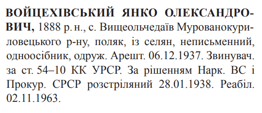 Соціальне походження: із селянОсвіта: неписьменнийПрофесія (місце роботи): одноосібникСімейний стан: одружений, 3 дітейЗаарештований: 06.12.1937Звинувачення: ст. 54-10 КК УССРНаркомом ВС і Прокурором СССР засуджений до розстрілуДата вироку: 03.01.1938 (протокол № 694)Янко Войцехівський розстріляний 28.01.1938 р. в м. Могилів-Подільський.Реабілітований: Верховним судом УССР 02.11.1963