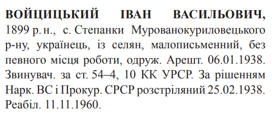 Соціальне походження: із селянОсвіта: малописьменнийПрофесія (місце роботи): без певного місця роботиСімейний стан: одружений, 3 дітейЗаарештований: 06.11.1938Звинувачення: ст. 54-4, 54-10 КК УССРНаркомом ВС і Прокурором СССР засуджений до розстрілуДата вироку: 08.02.1938 (протокол № 919)Іван Войцицький розстріляний в м. Вінниця 26.02.1938 р.Реабілітований: Верховним судом УССР 11.11.1960 р.(Можливі варіанти написання: Войціцький Ян, Войцицький Іван)
