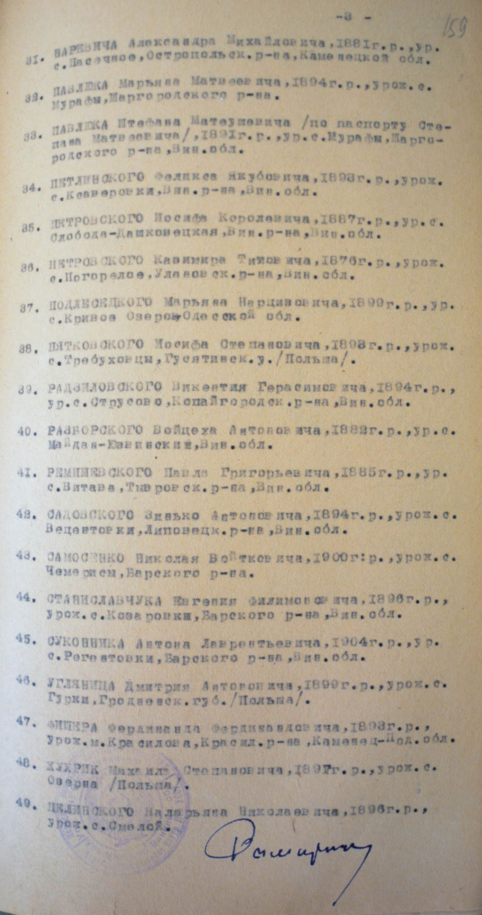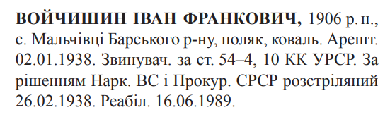 Соціальне походження: н/дОсвіта: н/дПрофесія (місце роботи): ковальЗаарештований: 02.01.1938Звинувачення: ст. 54-4, 54-10 КК УССРНаркомом ВС і Прокурором СССР засуджений до розстрілуДата вироку: 08.02.1938Іван Войчишин розстріляний 27.02.1938 р. у Вінниці.Реабілітований: Вінницькою облпрокуратурою 16.06.1989