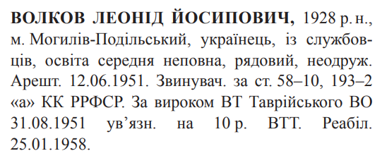 58-10, 193-2 "а" КК РСФСР. ВТ Тиврівського ВО засуджений до 10 років ВТТ