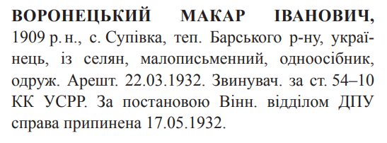 54-10 КК УССР. Вінницьким обласним відділом ДПУ справу припинено