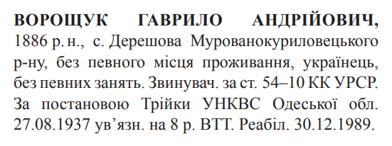 Реабілітований: Вінницькою облпрокуратурою 30.12.1989 Реабілітовані історією