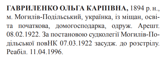 стаття не вказана. Судовою колегією Могилів-Подільської повітової ЧК засуджена до розстрілу