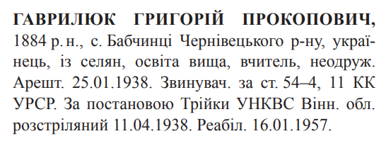 Григорій Гаврилюк розстріляний 11.04.1938