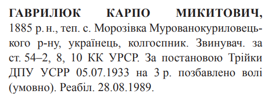 54-2, 54-8, 54-10 КК УССР. Судовою трійкою при Колегії ГПУ УССР засуджений до 3 років позбавлення волі (умовно)