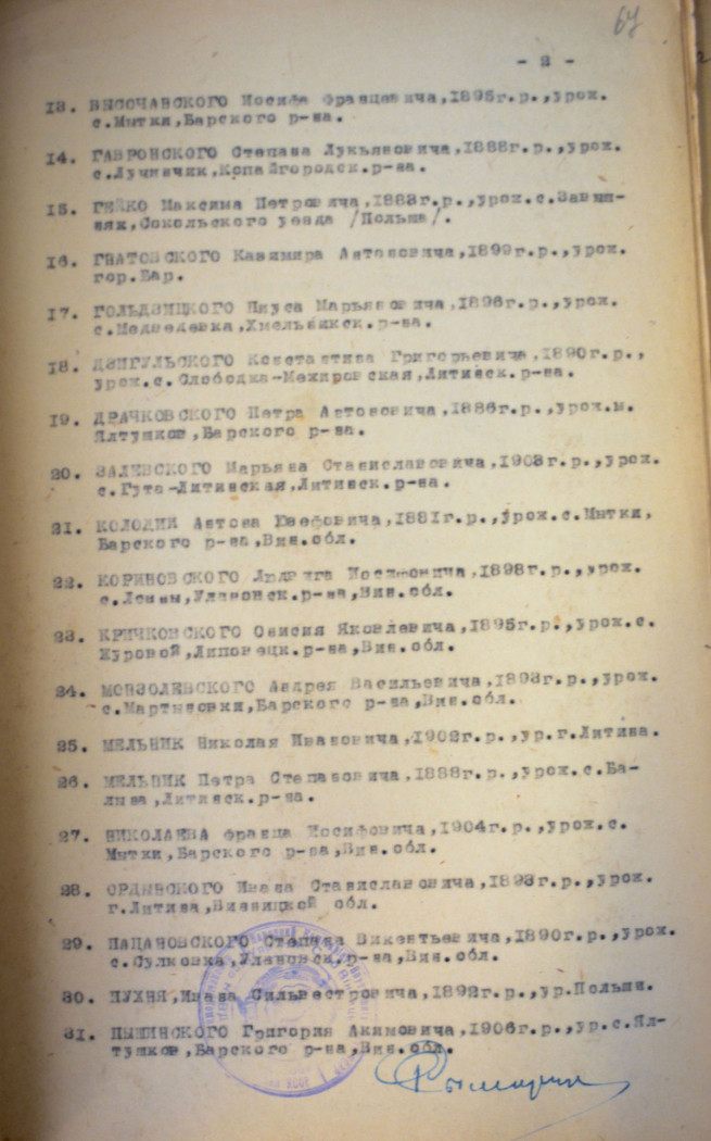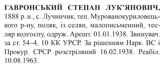 Соціальне походження: із селянОсвіта: малограмотнийПрофесія (місце роботи): тесляр колгоспуСімейний стан: одружений, 1 дитинаЗаарештований: 01.01.1938Звинувачення: ст. 54-4, 54-10 КК УССРНаркомом ВС і Прокурором СССР засуджений до розстрілуДата вироку: 03.02.1938Степан Гавронський розстріляний у Вінниці 17.02.1938 р.Реабілітований: Верховним судом УССР 10.08.1963 р.