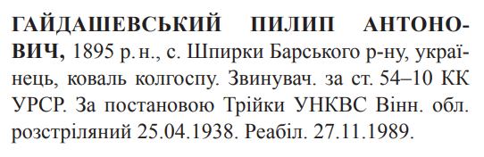 Пилип Гайдашевський розстріляний 25.04.1938