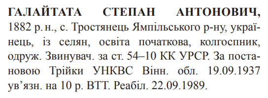54-10 КК УССР. Трійкою УНКВС Вінницької обл. засуджений до 10 років ВТТ