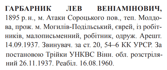 Лев Гарбарник розстріляний 26.11.1937