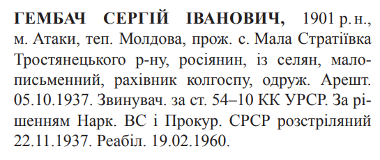 Сергій Гембач розстріляний 22.11.1937