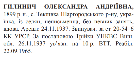 Реабілітована: Вінницьким облсудом 22.09.1965