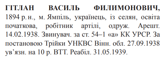 54-1 "а" КК УССР. Трійкою УНКВС Вінницької обл. засуджений до 10 років ВТТ