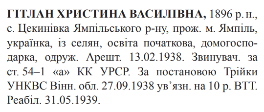 54-1 "а" КК УССР. Трійкою УНКВД Вінницької обл. засуджена до 10 років ВТТ