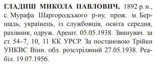 Участник збройного опору російському большевизму 1918-20 рр.Потрапив до полону. На особливому обліку ЧК-ГПУ з 1922 р.Заарештований: 05.05.1938Звинувачення: ст. 54-10, 54-11, 54-7 КК УССРТрійкою УНКВД Вінницької обл. засуджений до розстрілуДата вироку: 10.05.1938Микола Гладиш розстріляний 27.05.1938 р.Реабілітований: Вінницьким облсудом 19.07.1956