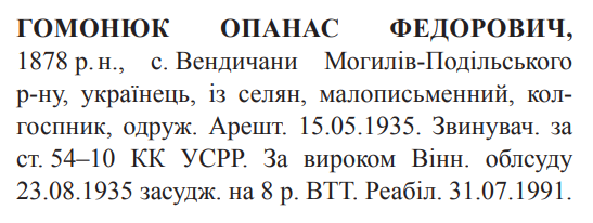 Реабілітований: Прокурором Вінницької обл. 31.07.1991