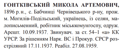 Микола Гонтковський розстріляний 17.11.1937