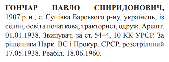 Павло Гончар розстріляний 17.05.1938