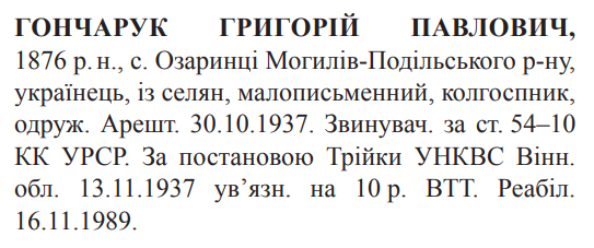 Реабілітований: Вінницькою облпрокуратурою 16.11.1989 Реабілітовані історією