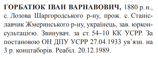 54-10 КК УССР. ОН при колегії ГПУ УССР засуджений до 3 років концтаборів