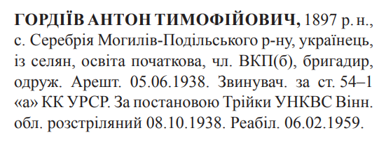 Антон Гордієв розстріляний 08.10.1938