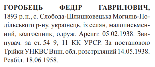 Реабілітований: Вінницьким облсудом 18.06.1958 Реабілітовані історією