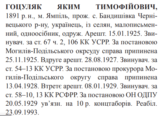 Учасник збройного опору російському большевизму.Потрапив до полону.Перебував на особливому обліку ГПУ.Заарештований: 15.01.1926Звинувачення: ст. 67 ч.2, 106 КК УССРСправу припиненоДата вироку: н/дЗаарештований: 28.08.1927Звинувачення: ст. 54-13 КК УССРПрокурором Могилів-Подільського округу справу припиненоДата вироку: 13.04.1928